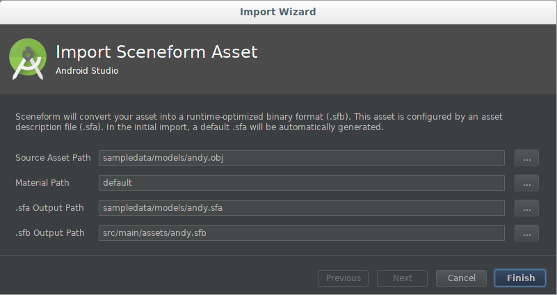 sceneform.asset()sử dụng trong app\39;sbuild.gradlevà xác định vị trí tạo các tệp*.sfavà*.sfbtrong dự án.Nếu đây là lần đầu tiên bạn nhập một mô hình, hãy sử dụng các giá trị mặc định.