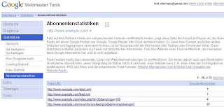 Ab sofort sind auch Abonnetenstatistiken online einsehbar. Feed-Publisher können sich mittels der Webmaster-Tools über die Abonnenten von Google-Diensten wie Google Reader , iGoogle und Orkut informieren. Wir hoffen, dass dies das Erfassen von Abonnentenstatistiken für unterschiedliche Feed-Formate vereinfacht und eine Verbesserung gegenüber dem Parsen von Server-Logs darstellt.