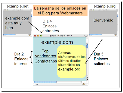 Cuando enlazas a sitios externos estás utilizando enlaces salientes. Por ejemplo, www.google.com/intl/es/webmasters/ enlaza con el dominio googlewebmaster-es.blogspot.com/ (¡nuestro maravilloso blog!). Los enlaces salientes nos permiten navegar la web: son una de las principales razones por las que Internet es tan apasionante y una gran fuente de colaboración. Sin enlaces salientes, tu sitio puede parecer aislado de la comunidad y sus páginas un mero conjunto de folletos. La mayoría de sitios web incluyen enlaces externos de forma natural y no debemos preocuparnos al respecto. Si aún tienes dudas, puedes consultar información más detallada que proporcionaremos el tercer día.Día 4: Enlaces entrantes (aquellos enlaces que recibes de sitios externos)