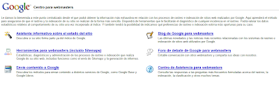 Para empezar contamos con el Centro para webmasters de Google, el cual se divide en dos partes: los enlaces a las herramientas y los enlaces a los recursos de "ayuda". En esta segunda parte contamos con: