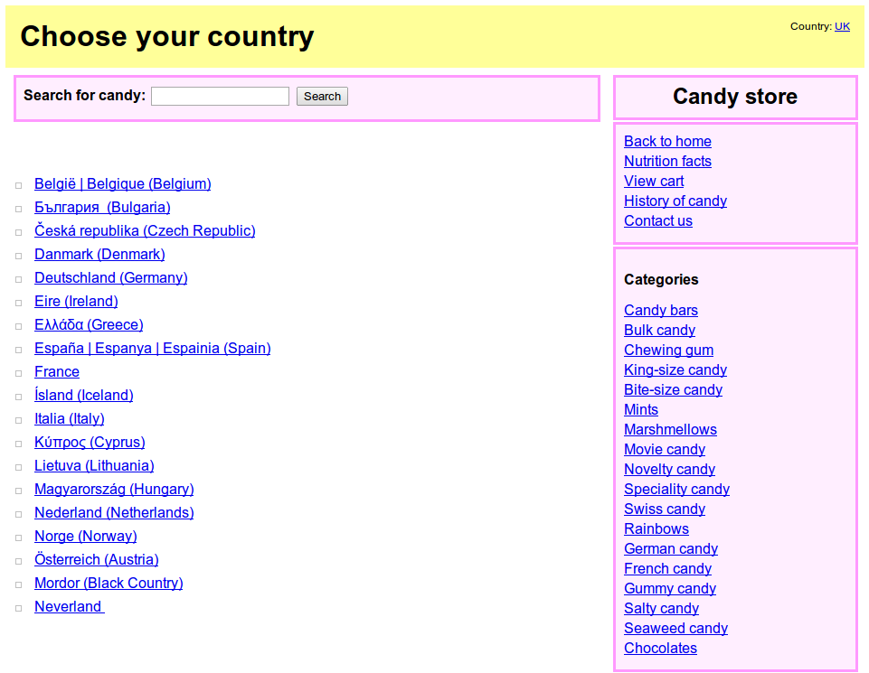 Apa pun konfigurasi yang dipilih untuk diterapkan, Anda harus memastikan bahwa semua laman – termasuk laman pemilih negara dan bahasa: