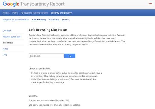 Bu aracı Google'ın Güvenli Tarama Şeffaflık Raporu'nda barındırıyoruz. Google'ın Şeffaflık Raporu'nun diğer bölümlerinde olduğu gibi, bu verileri de herkese açık bir şekilde kullanıma sunarak online ekosistemin güvenliği ve sağlığına daha fazla görünürlük kazandırıyoruz. Site Durumu Aracı'nın kullanıcıları, araca bir web sayfası (URL, web sitesi veya alan adı olarak) girdiğinde söz konusu web sayfasıyla ilgili Güvenli Tarama analizinin en son sonuçlarının yanı sıra sorun giderme yardımına ve eğitim materyallerine yönelik referanslar döndürülür.