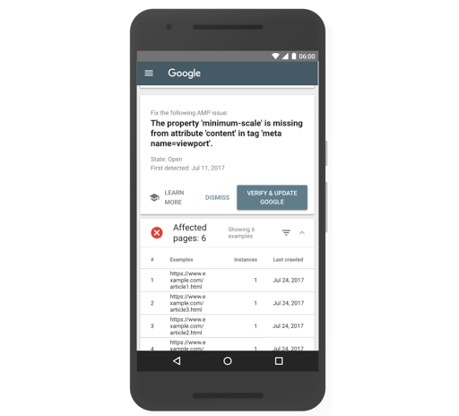 Yeni AMP düzeltme deneyimi, AMP Sorunları raporuyla başlar. Bu rapor, sitenizi etkileyen mevcut AMP sorunlarını, temel hataya göre gruplandırılmış olarak gösterir. Sorunu ayrıntılı olarak inceleyerek etkilenen örnek sayfalar da dahil olmak üzere daha fazla bilgi edinebilirsiniz. Temel sorunu düzelttikten sonra, düzeltmenizi doğrulamak için bir düğmeyi tıklayın ve Google'ın bu sorundan etkilenen sayfaları yeniden taramasını sağlayın. Google, yeniden tarama işleminin ilerleme durumunu size bildirir ve düzeltmeleriniz doğrulandığında raporu günceller.