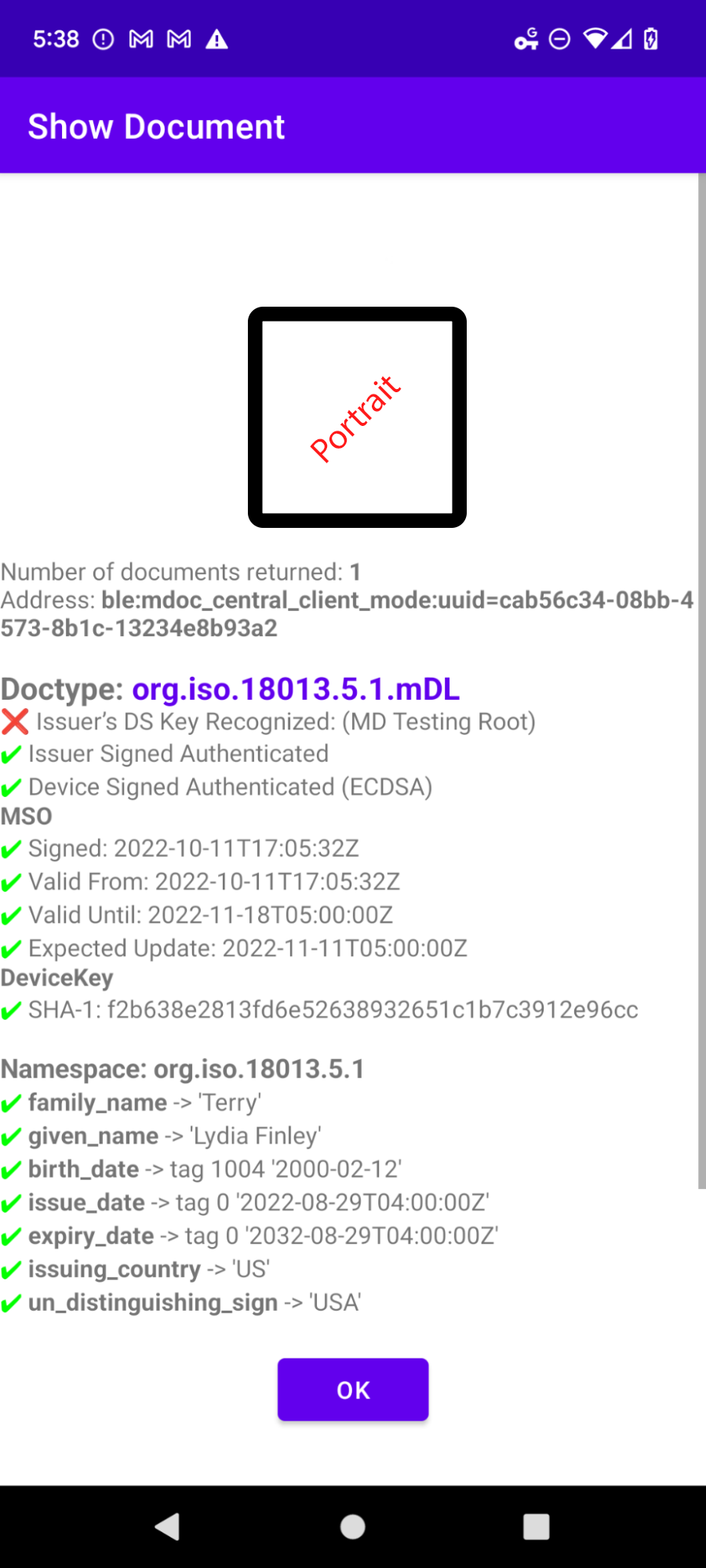 4. After sending the data, the VDC device will briefly disconnect. You'll then see the VDC details appear on the reader device. Make sure all the checks show a green checkmark except for "Issuer's DS Key recognized."