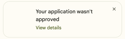 7. Clicking on either the notification or the rejection card should take you to a page explaining that the application was rejected