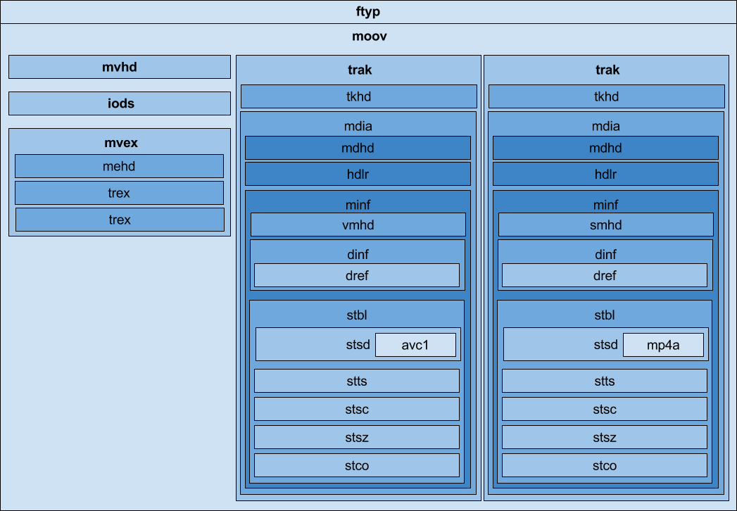 यहां दिए गए डायग्राम में, मल्टीप्लेक्स किए गए आईएसओ बीएमएफ़ इनिशियलाइज़ेशन सेगमेंट का लेआउट दिखाया गया है. ज़रूरी नहीं कि YouTube, ऐटम का इस्तेमाल करे. हालांकि, यह एक उदाहरण है. खास तौर पर, ऑडियो और वीडियो, दोनों ट्रैक दिखाए जाते हैं.