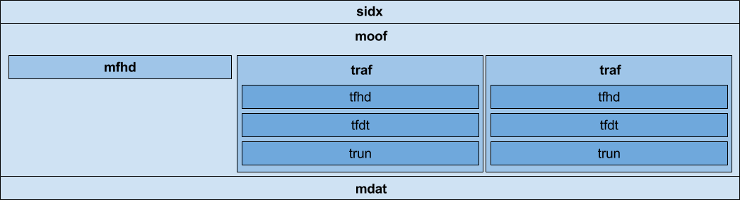 O diagrama a seguir mostra o layout de um exemplo de segmento de mídia ISO BMFF multiplexado. O YouTube não usa necessariamente todos os átomos, mas este é um exemplo compatível. Em particular, as faixas de áudio e vídeo são representadas. Uma série desses segmentos pode ser anexada a um segmento de inicialização para produzir um fluxo ISO BMFF multiplexado válido e completo.