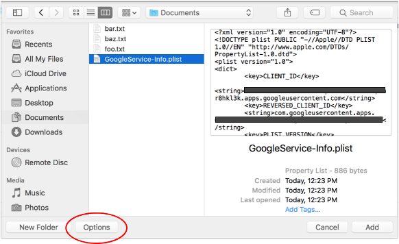 6. Найдите загруженный ранее файл GoogleService-Info.plist и выберите его. Нажмите кнопку «Параметры» .
