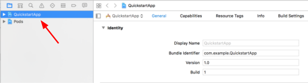 8. Не снимая выделения с узла проекта, выберите «QuickstartApp» в разделе TARGETS , как показано на двух изображениях ниже: